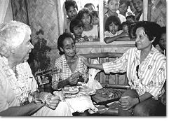 Rheinisch-Bergischer Kreis - Nachdem das Auto im Örtchen Tigaon links abgebogen ist, dauert es nicht lange, bis der Asphalt aufhört. Wasserbüffel, Reisfelder und Kokospalmen säumen die Piste, die Richtung Berg Isarog führt. Der Weg zu Maria Estrella Samonte (50) ist lang. Vom Bergischen bis zur Provinzhauptstadt Naga in Camarines Sur auf der philippinischen Hauptinsel Luzon brauchten der Forsbacher Professor Dr. Jürgen Menzel und seine Frau Heide zwei Tage. Dann dauert es noch mal anderthalb Stunden, bis es im Auto plötzlich heißt: „Aussteigen!“ Sozusagen im Nichts. Aber dann tauchen sie aus dem Grün auf, die Ureinwohnerkinder, die sich zur Feier des Tages traditionelle Blätterkleider angezogen und Federn ins dichte Haar gesteckt haben. Und dann kommt auch Maria. Der reisefreudige Chefarzt, der die 35 Kilo leichte Ureinwohnerin vor einem Jahr kostenlos in der Neurochirurgie Köln-Merheim von ihrem Makel befreit hatte, wollte seine Ausnahme-Patientin wiedersehen. Denn obwohl er viele Menschen aus aller Welt operiert habe, sei Maria „etwas ganz Besonderes“, ihr Fall „einzigartig“. Doch ohne die Hilfe von Carmen Rössel-Dapilos wäre es schwer gewesen, die Aeta-Ureinwohnerin aufzuspüren. Doch die Bensbergerin, die neben ihrer Arbeit als Krankenschwester am Evangelischen Krankenhaus Bergisch Gladbach zahlreiche Hilfsprojekte in ihrer philippinischen Heimat organisiert, kennt sich aus und versteht den Dialekt. Sie hat eine Vorschule in Marias Stamm der Cuayaoyao gegründet und bei deren Besuch war ihr Ende 2001 Maria buchstäblich über den Weg gelaufen. Damals entstellt von einer überdimensionalen Wucherung (Meningozele) an der Stirn, die - eine Laune der Natur - exakt die Form einer weiblichen Brust hatte. Die Besucher werden von den Aeta mit Blumen bekränzt. Strahlend nimmt Maria den deutschen Chefarzt, der neben der 1,43 Meter kleinen Frau wie ein Hüne wirkt, am Arm und führt ihn durch ihr Dorf. Selbstbewusstsein und Würde strahlt sie aus. Sie sei „sehr glücklich“, sagt sie. „Ich fühle mich wie neugeboren.“ Vorbei ist die Zeit, in der sie wegen ihres Makels von den Kindern verlacht und von Schwangeren angstvoll gemieden wurde. Vorbei ist auch die Zeit, in der sie zum Schlafen sieben Quadratmeter Erdboden mit der neunköpfigen Familie des Bruders in seiner Palmenhütte teilte. Maria ist jetzt eine kleine Königin, eine Prominente. Durch Spendengelder aus Deutschland hat sie sogar ein eigenes Haus, das größte im Dorf mit luftigen 60 Quadratmetern aus Stein und Bambus. Sie bewohnt es mit Nena, einer ebenfalls ledigen Frau. Gemeinsam kümmern sie sich um den Garten, in dem Ananas, Auberginen, Tomaten, schwarzer Pfeffer und Kokospalmen wachsen. Ein Schwein, Hühner und ein Wasserbüffel gehören auch dazu. Damit kein Neid im Stamm aufkommt, gehört alles formal der Hänsel & Gretel Foundation, dem philippinischen Verein von Carmen Dapilos. Vielleicht das kostbarste Gut im Haus von Maria: das Fotoalbum. Sie zieht es aus dem Regal und schaut sich mit Menzels die Bilder an, lässt die Tage in Deutschland und die Geschichte ihrer ungewöhnlichen Operation noch mal Revue passieren. „Vergleichliches hat es nicht gegeben“, kommentiert Jürgen Menzel das Bild, das Maria mit der Meningozele zeigt. „Aus Menschlichkeit“ und aus „medizinischem Interesse“ habe er geholfen. Maria, die schamhaft ihren Kopf mit einem Tuch verhüllt. Maria beim Schreiben lernen. Maria im Kernspin. Maria mit Professor Dr. Bernhard Liedtke vom Evangelischen Krankenhaus, der den Kontakt zu Menzel herstellte. Maria im OP, als der Neurochirurg das Loch im Schädel schloss. Maria mit Professor Dr. Dr. Gerald Spilker, dem Chefarzt der Plastischen Chirurgie Köln-Merheim, der kostenlos den Hautsack abnahm und die Augenpartie richtete. „Es hätte etliche Komplikationen geben können“, sinniert Jürgen Menzel. Zufrieden mit dem Heilungsprozess betrachtet er seine Patientin, die gerade von der mitgebrachten Schokolade nascht: „Der Fall ist abgeschlossen.“ Die Stammesangehörigen, die sich eben am Fenster drängten, strömen zur Stammeshalle, um den deutschen Gästen Lieder und Tänze der Aeta-Kultur zu präsentieren. Für sie ist das, was Maria erlebte, kaum nachvollziehbar. Sie leben ohne fließendes Wasser und Strom, kennen weder Lift noch WC. Maria hatte vor ihrem Deutschland-Abenteuer in keinem Auto gesessen, in keinem Bett geschlafen, musste lernen in Schuhen zu gehen und Treppen zu steigen. Aus dieser fremden Welt kam sie für den Stamm wundersam geheilt zurück. Plötzlich war sie keine Randfigur mehr, sondern Mittelpunkt. Sogar der Häuptling tanzte mit ihr. Es war der erste Tanz ihres Lebens. Sehr bewegt ist der Arzt, als es Abschiednehmen heißt. „Der enorme Einsatz