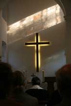 während eines Gottesdienstes schoss - mit Lichtspielen am Altarkreuz.